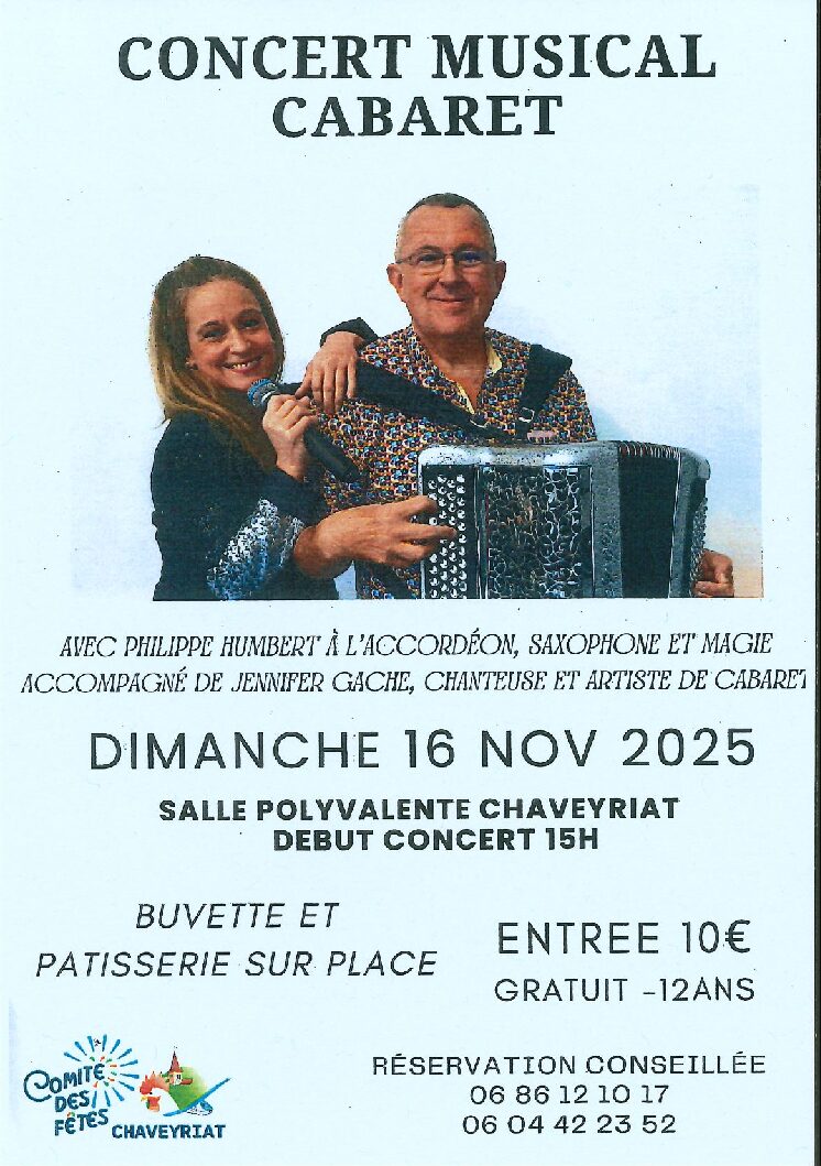 Le Comité des Fêtes de CHAVEYRIAT organise un Concert Musical Cabaret le 16 Novembre 2025 à la Salle Polyvalente de CHAVEYRIAT, à partir de 15 h 00.