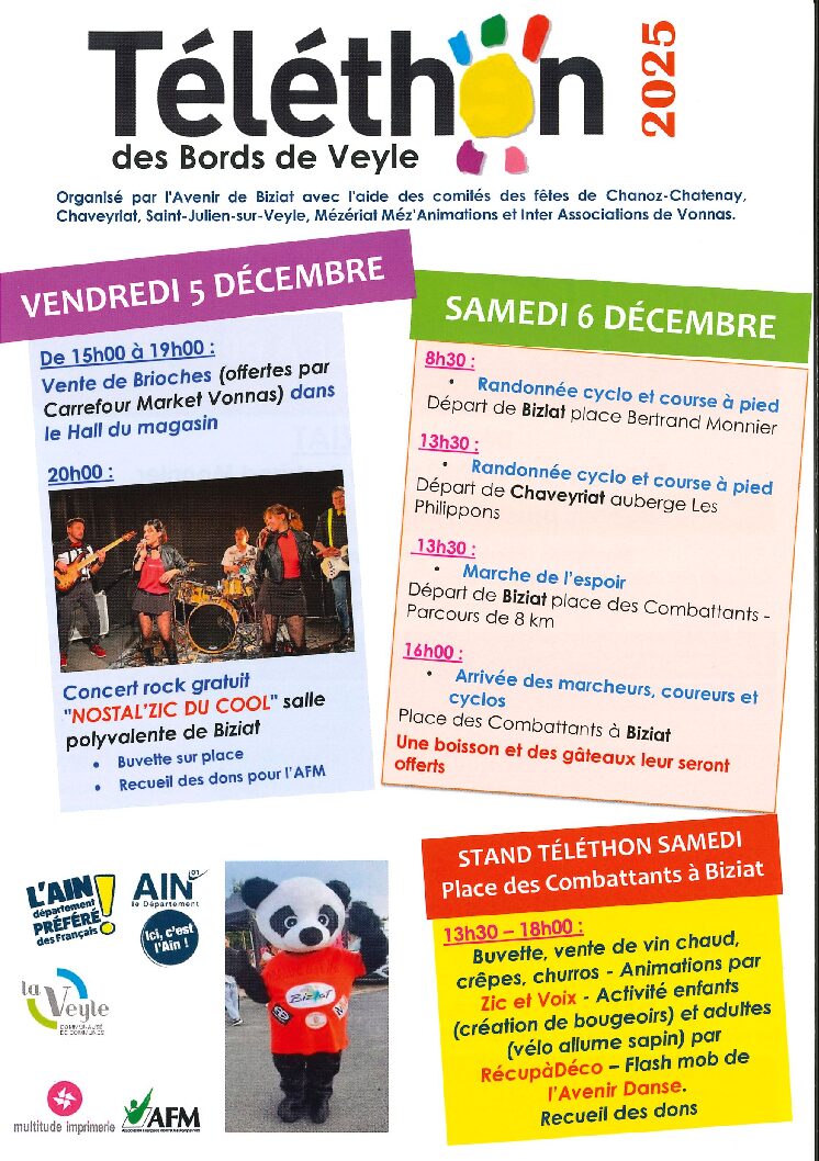 TELETHON 2025 Cette année, le téléthon se déroule à Biziat du 05 au 06 décembre 2025 Téléthon Téléthon programme 00 jours 00 heures 00 minutes 00 secondes Date Déc 05 - 06 2025 Lieu BIZIAT Organisateur L'Avenir de BIZIAT + Comité des Fêtes Partagez cet événement